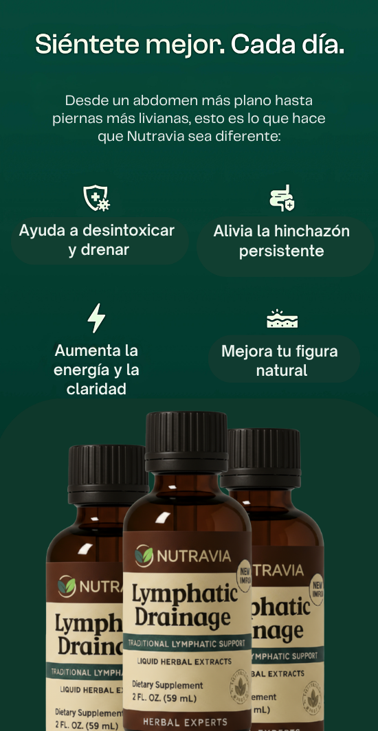 NUTRAVIA no es un diurético ni un laxante. Su acción es natural, suave y progresiva, enfocada en reactivar el flujo linfático, no en forzar al cuerpo a eliminar líquidos. Esto ayuda a reducir la hinchazón sin deshidratarte ni alterar tu digestión.